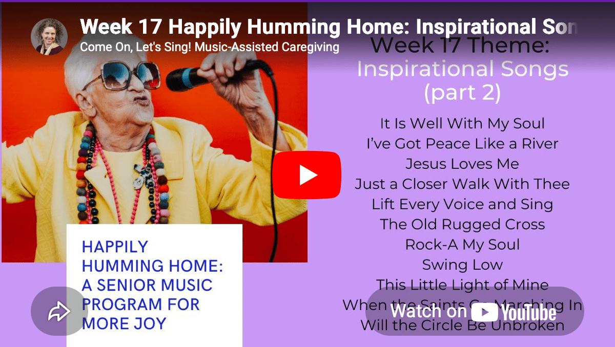 This is week 17 of the year and we will be celebrating Inspirational Songs (Part 2), by delving into the songs and applying concepts to create more joy and connection during caregiving routines with music.